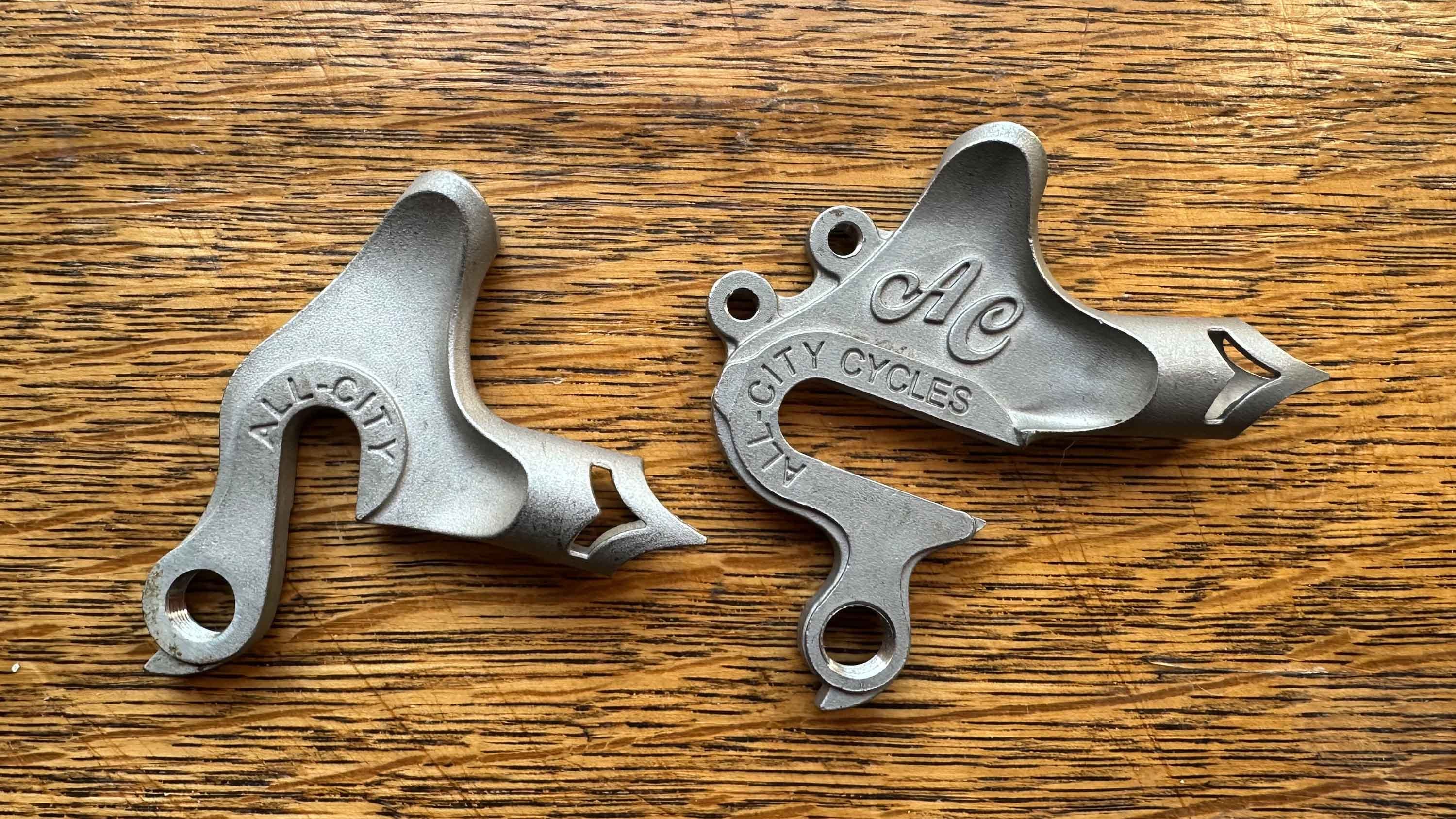 The double guides for All-City (left) offered a tidy way to secure a rear derailleur housing and rear brake hose (back when mechanical shifting was still a thing). Schwinn designed these dropouts for Richard Sachs to help him cut down on finishing time. “He was doing a lot of modification and refinement on each frame to finish. I just built all of that style into an 11-speed compatible dropout.”